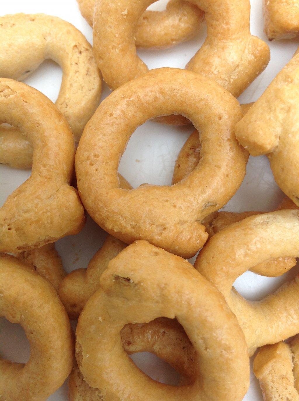 Aufgrund eines Antiken Apulisches Rezept,werden die Taralli für den ersten Garungsvorgang in heissem wasser gekocht um sie dann für den zweiten wichtigen garungsvorgang im Backofen zu schieben,sodass sie dann die richtige knusprigkeit erhalten. Hinter dieser Arbeit steckt eine antike Apulische Tradition und Kultur.