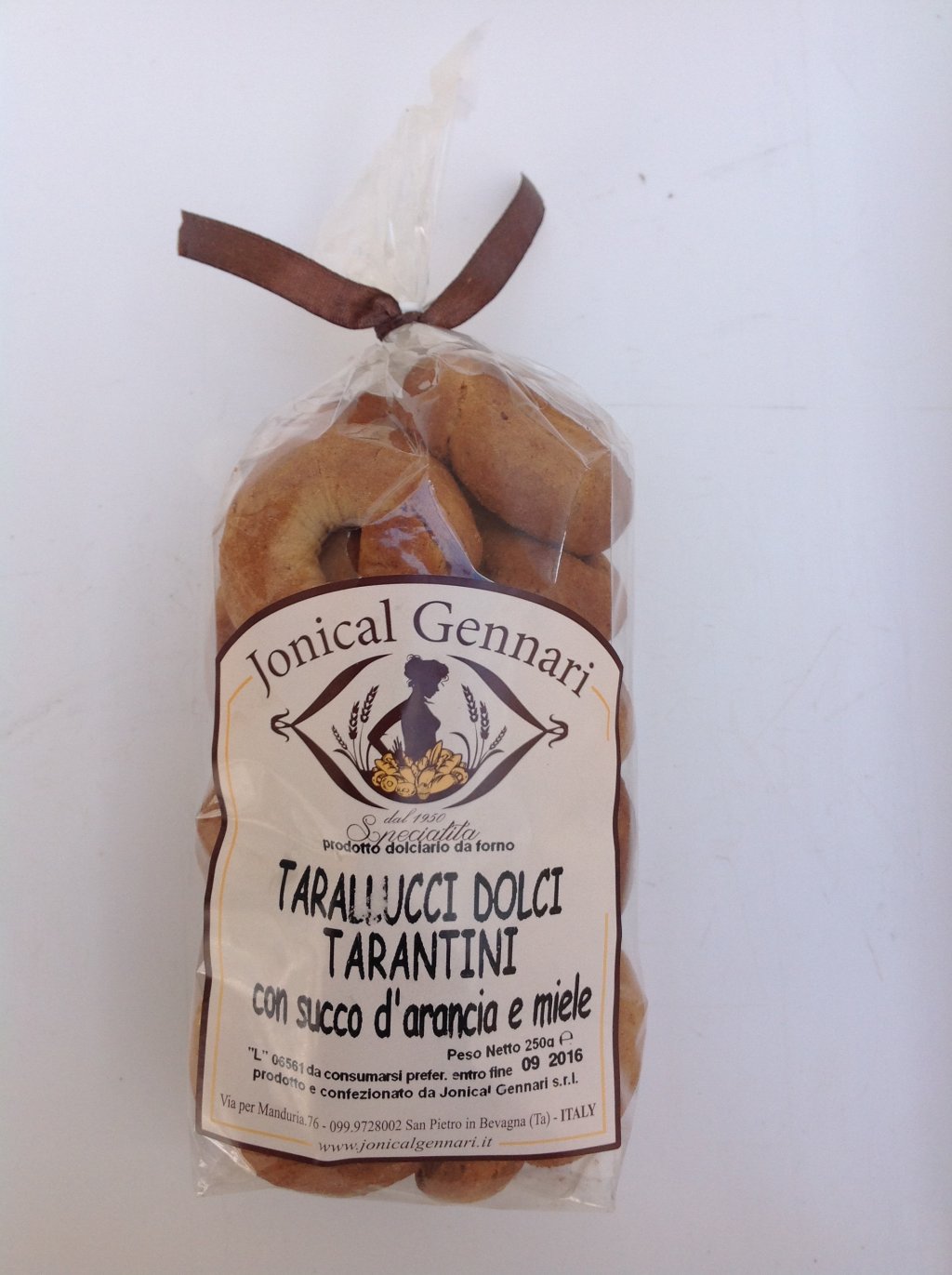 Wheat flour type "0" (contains gluten), sugar, olive oil, orange juice (7%), yolk, honey (2.6%), anise liquor, alcohol, Ammonium bicarbonate and sodium bicarbonate, disodium pyrophosphate raising agents: fresh eggs, cinnamon, orange peel, cloves, vanilla, salt.