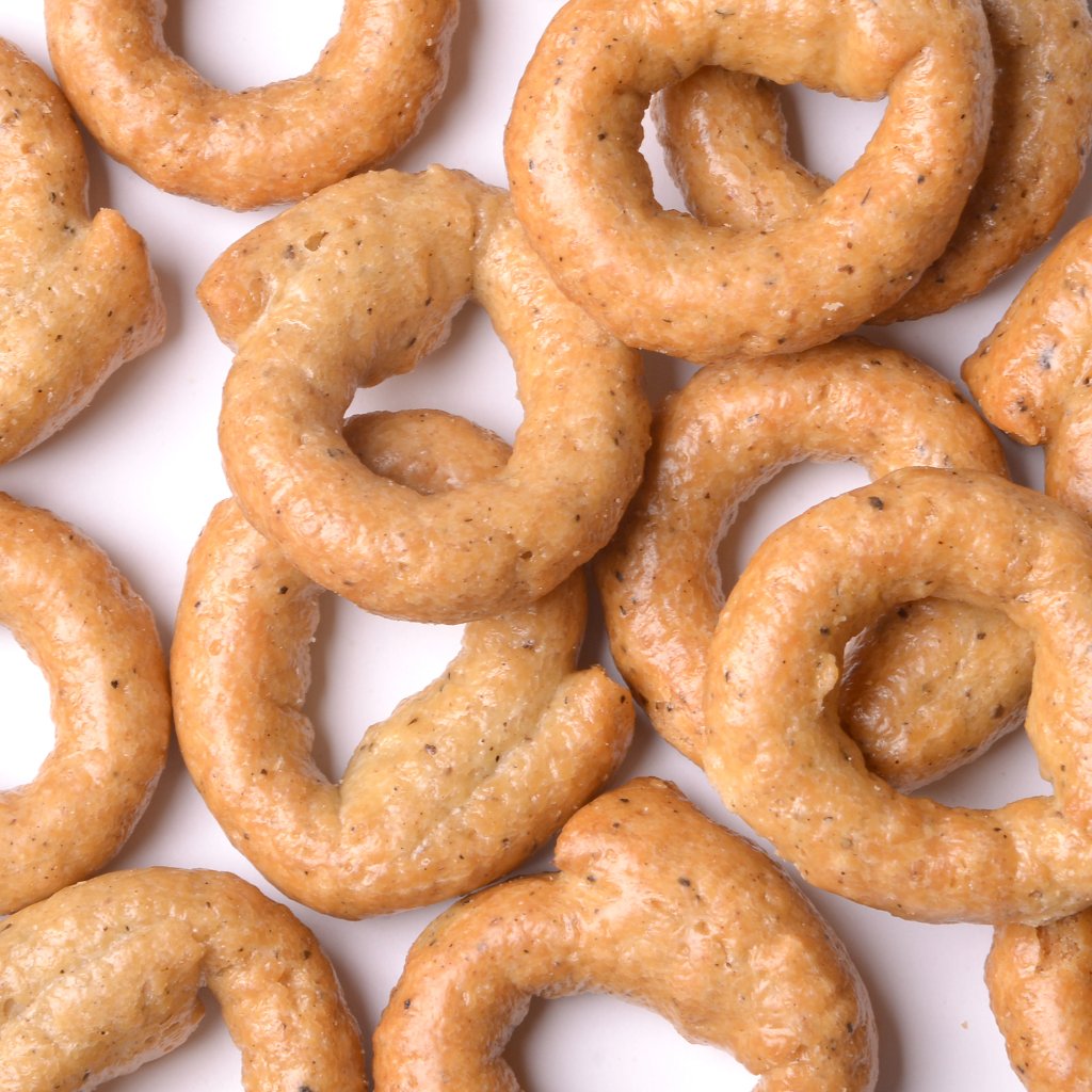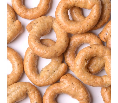 According to an ancient original recipe, we prepare this taralli in two important steps: at first we cook them for a certain time in boiling water, after this second step is, to put them on baking sheets and let them bake in the oven till they get golden and the right crispiness. All this because of an antique tradition of our "Puglia"