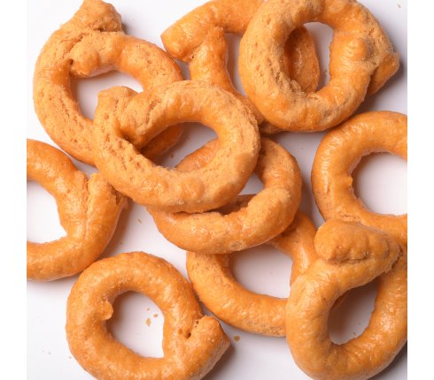 According to an ancient original recipe, we prepare this taralli in two important steps: at first we cook them for a certain time in boiling water, after this second step is, to put them on baking sheets and let them bake in the oven till they get golden and the right crispiness. All this because of an antique tradition of our "Puglia"