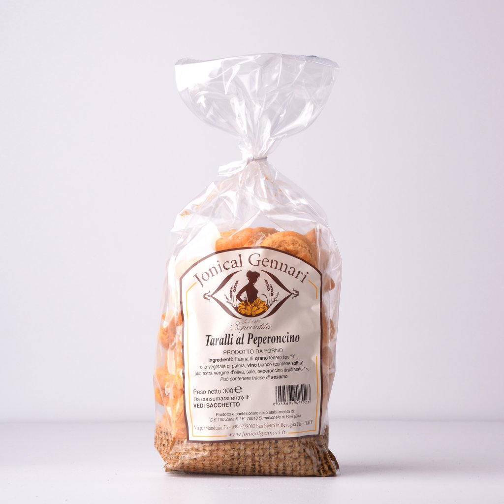 Soft wheat flour type "0" Palm vegetable oil, white wine (contains sulfites), olive oil, salt, dehydrated chili 1%, may contain traces of Sesame