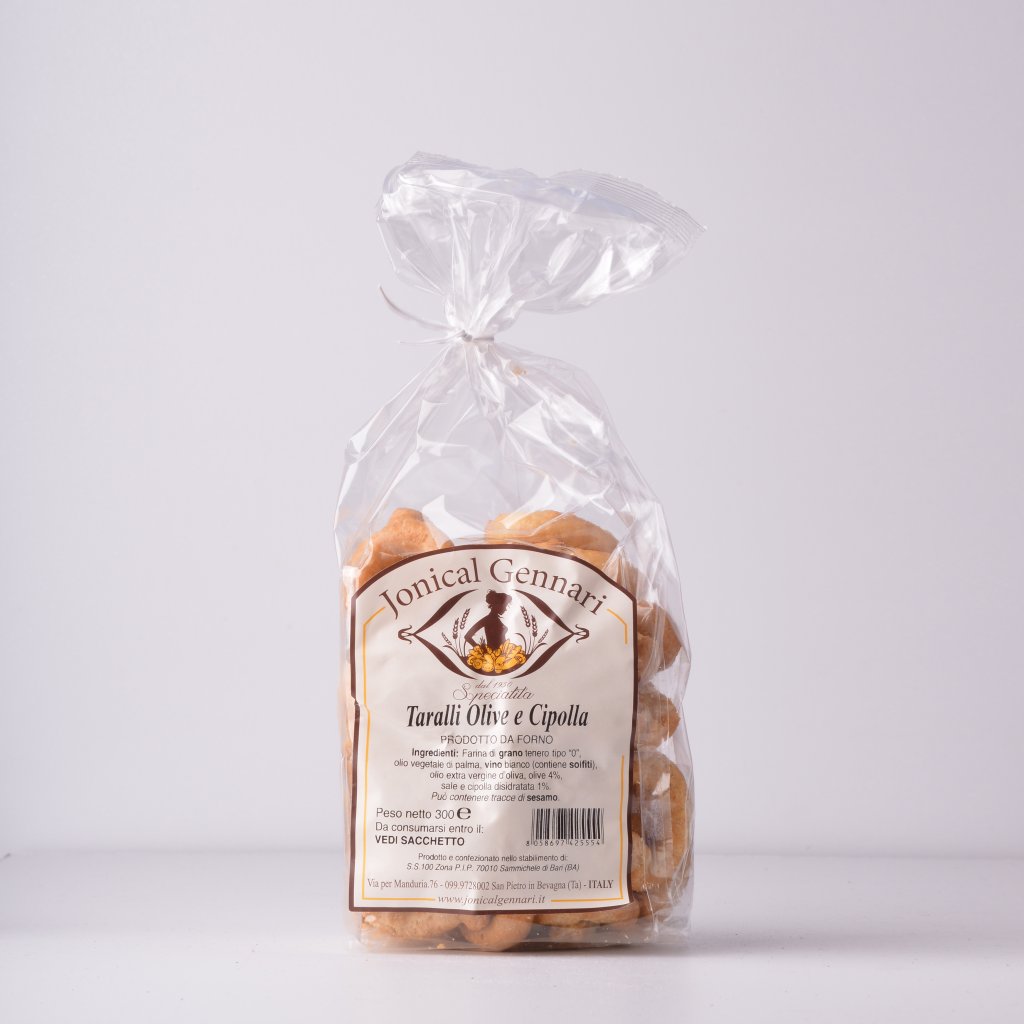 According to an ancient original recipe, we prepare this taralli in two important steps: at first we cook them for a certain time in boiling water, after this second step is, to put them on baking sheets and let them bake in the oven till they get golden and the right crispiness. All this because of an antique tradition of our "Puglia"